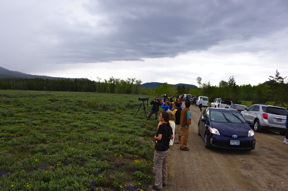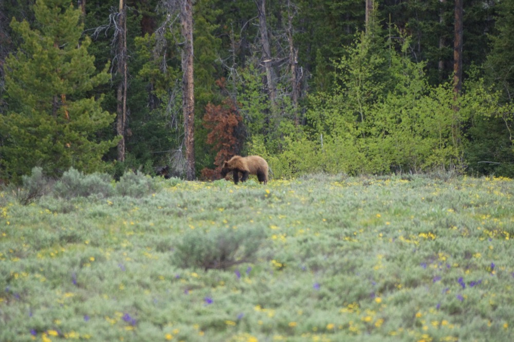 Im Grand Teton angekommen besserte sich das Wetter aber merklich, und wir wurden schon sehr bald auf eine grosse Menge geparkter Fahrzeuge und Menschen mit Fotoapparaten aufmerksam. Das liess uns nicht unbeeindruckt und wir wendeten, um ebenfalls nachzusehen. Wir wurden belohnt mit dem Blick auf einen relativ kleinen und dünnen Grizzly (ursus arctus horribilis), erkennbar an seinem Buckel. Offenbar hatte dieser nach dem Winterschlaf noch keine ausführlichen Fresstouren unternommen. Sonja wurde angesichts der Tatsachen, dass sich Bären mit über 60 km/h fortbewegen können und Allesfresser sind, doch etwas mulmig zumute.
