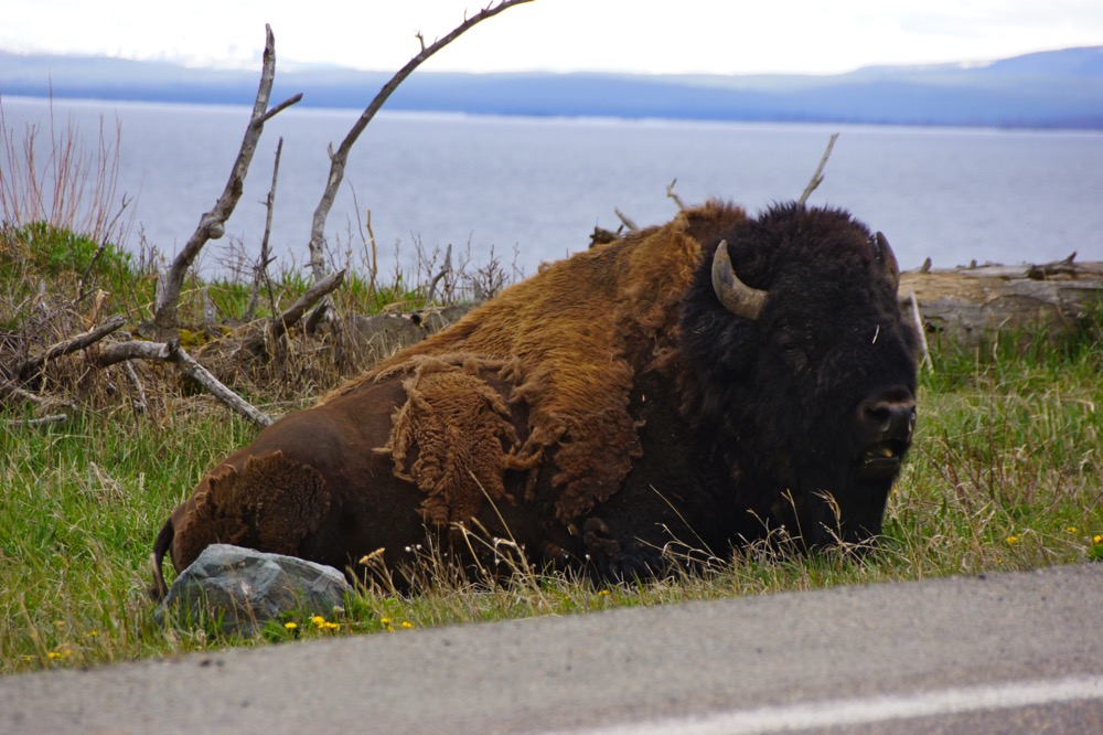 Im Yellowstone angekommen wurde uns sehr bald das Ausmass und die Vielfalt dieses unglaublichen Parks bewusst. Einmal mehr geht nichts ohne Auto. Vom Westeingang her kommend, fährt man zuerst über einen Pass und erblickt dann bald den riesigen Yellowstone Lake, auch hier mit den malerischen Schneebergen im Hintergrund.