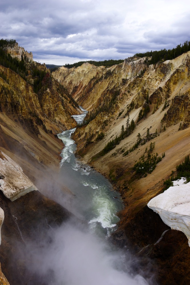 Da der Yellowstone von einmaligen Naturphänomenen über eine interessante Wildtierpopulation eigentlich über alles verfügt, war es nicht weiter erstaunlich, dass wir auch imposante Wasserfälle antrafen. Der höhere stürzt sich 90 m in die Tiefe. Wir rissen uns zusammen und nahmen den Serpentinenweg mit 300 Höhenmetern Unterschied in Angriff. So gelangten wir zur „Absturzkante“ des Lower Falls, wo wir die unglaubliche Wucht des Wassers hautnah erleben konnten. Und ja, bei der weissen Masse auf dem Felsen im Bild rechts handelt es sich tatsächlich um Schnee! Auf Schneereste trafen wir an verschiedenen Orten, kein Wunder bei den sehr bescheidenen Temperaturen von knapp 10 Grad... Auch von Regen blieben wir am Nachmittag leider wieder nicht verschont.